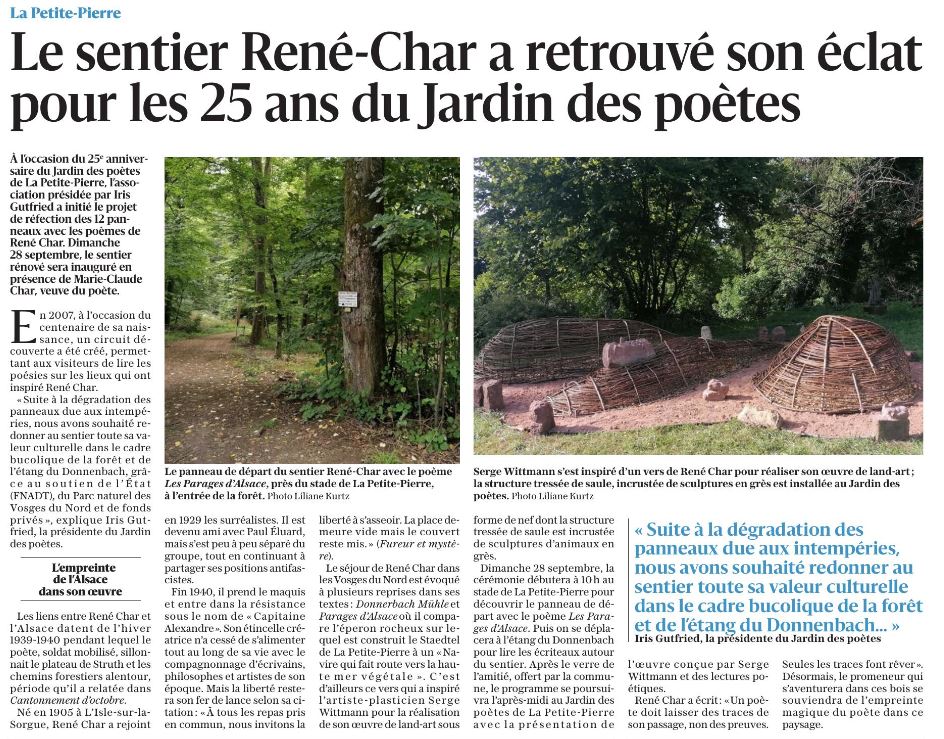 Le sentier René Char : Sentier rénové avec l'aide du Club Vosgien.Inauguration le dimanche 28 septembre à 10h en présence de Marie-Claude Char.